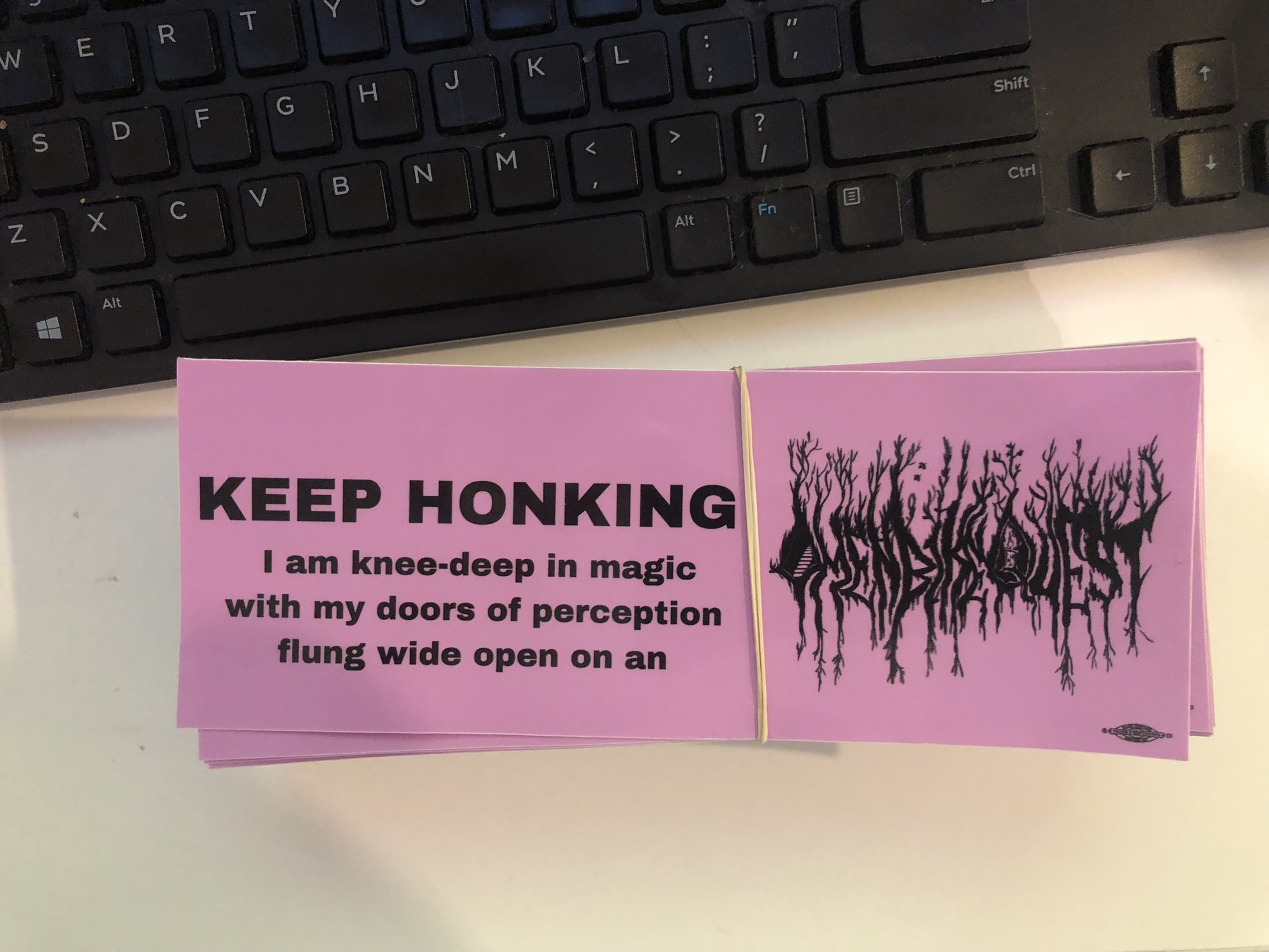 Also, complete side tangent, but I am still devoted to making stupid stickers that no one asked for but I want to put on my cargo bike. I had an omen bike quest one printed with a logo I commissioned from thee bicycle wizard of the southeast. Moss killed this logo and I pared it with some irreverent Aldous Huxley-esq text that seemed to make sense to me. As per usual, I will get this on the website sometime in the next century, because I am America’s worst business person. However, if you gotta have it now, just message me and I will reward you being a greasy wheel. I am all for rewarding anti-business activities, especially if they are waged against me running a business. Again, these are union printed in Denver at Artist Proof Collective, who are wonderful and deserve all your printing business. That’s their shop logo down in the right hand corner. They also let me send them my Entrancing Enya mix. That’s how awesome they are. I also still have my two weaving related stickers up on the webstore still, if you want one of those.