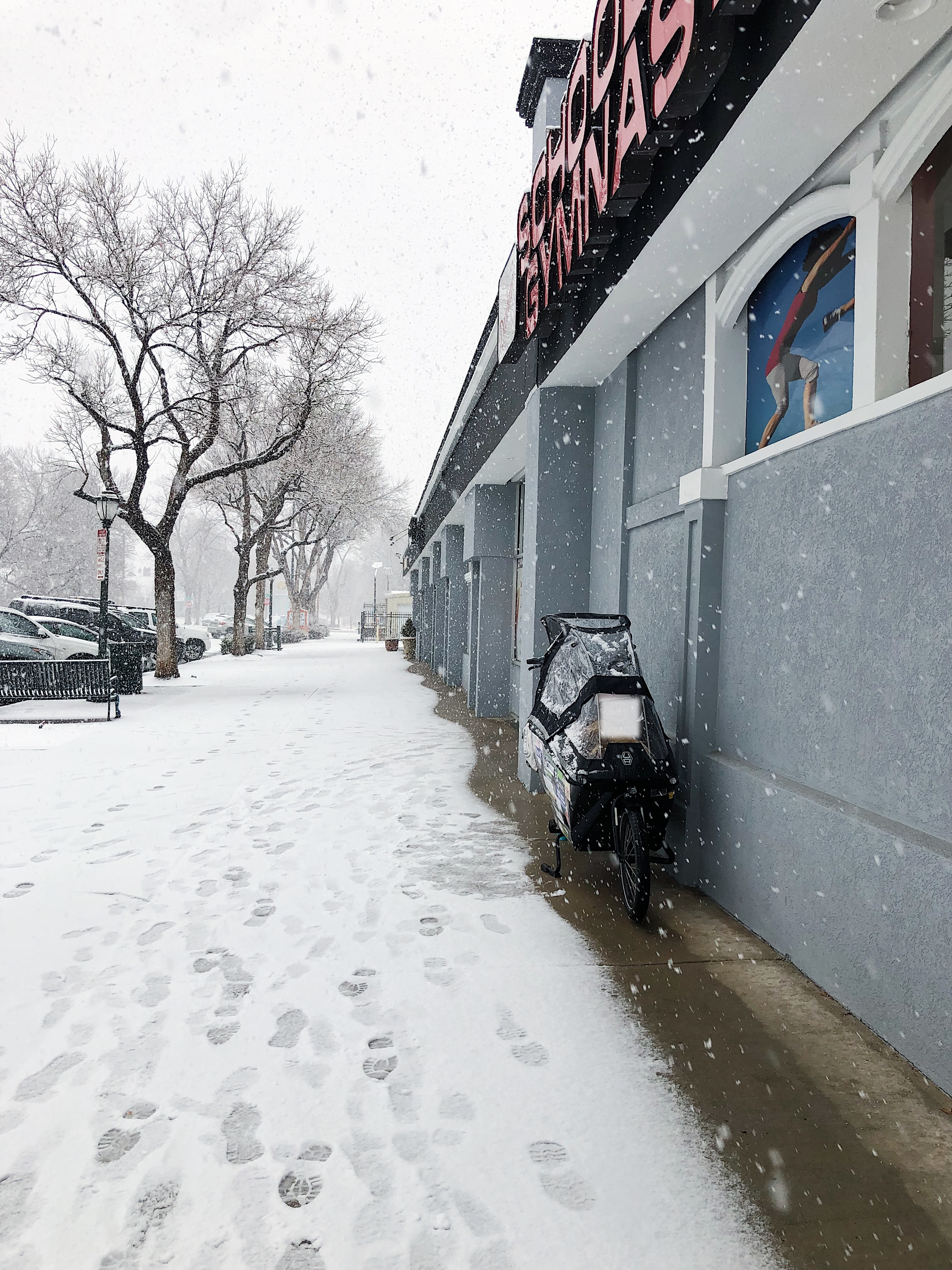 Today, dropping the facade looked like taking Juniper to her gymnastics class on the cargo bike, because I do not own a car. I didn’t make it some big deal on the internet by claiming I was saving the world with riding a bike. If you actually run the stats on fuel savings from riding bikes, its not doing that much. Typically, the machinations of the seasons aren’t too much of an impediment, leaving us sometimes a bit too cold or a bit too hot. Today, an icy rain gave way to blizzard conditions in the manner of the 30 minutes we spent jumping on trampolines.