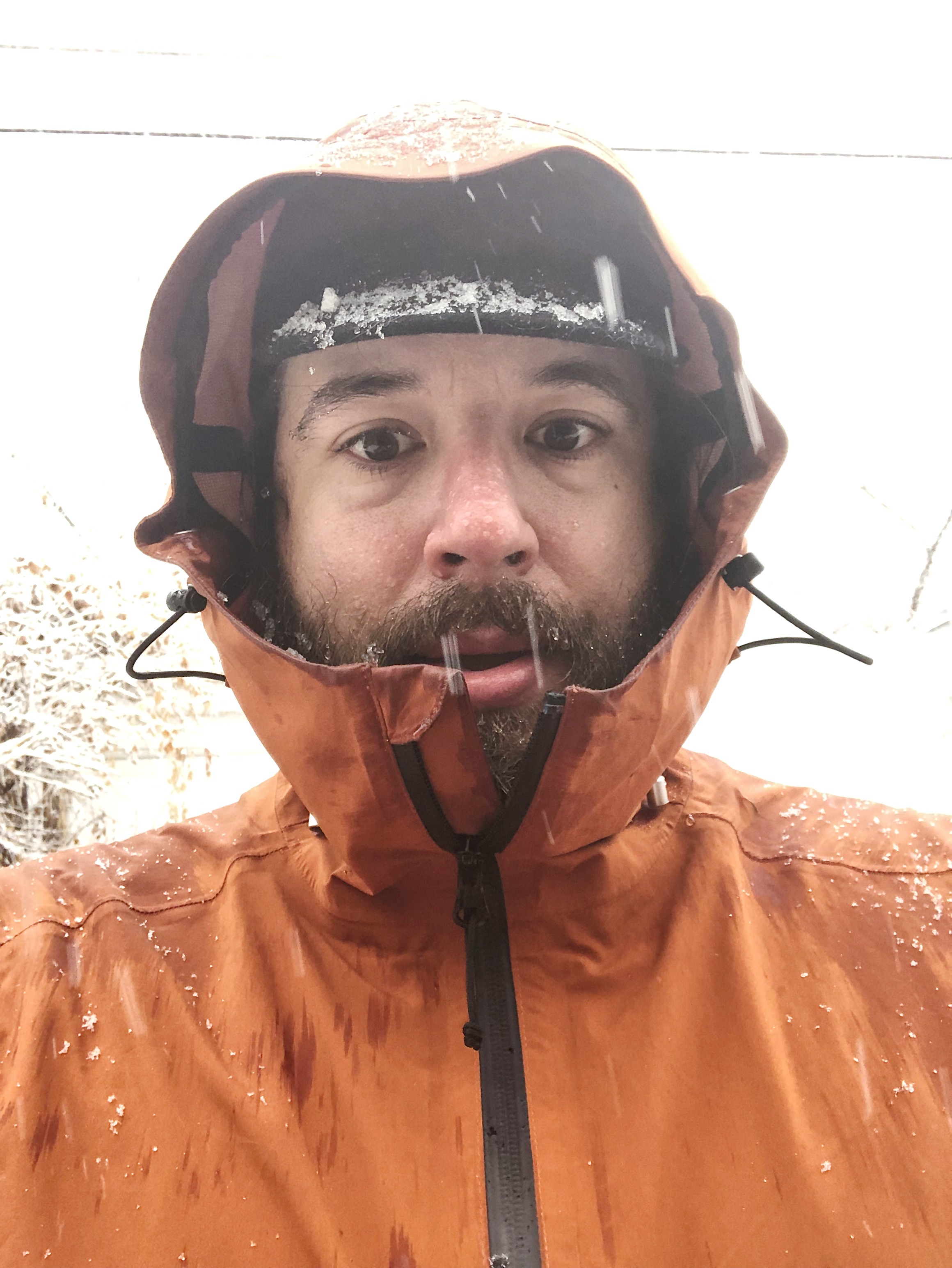 Consequently, rather than slapping some of my own meaning as a façade over the storm by depicting us CURSED for our infidelity to some great gelatinous glob, Juniper and I just got in rhythm with it, moving slowly threw the growing snow drifts. Our solitary little bike track marked our little break with incessant meaning-making that our society engages in. I took this photo of myself, drenched in direct experience for a chronicle of the way of silent druid.
