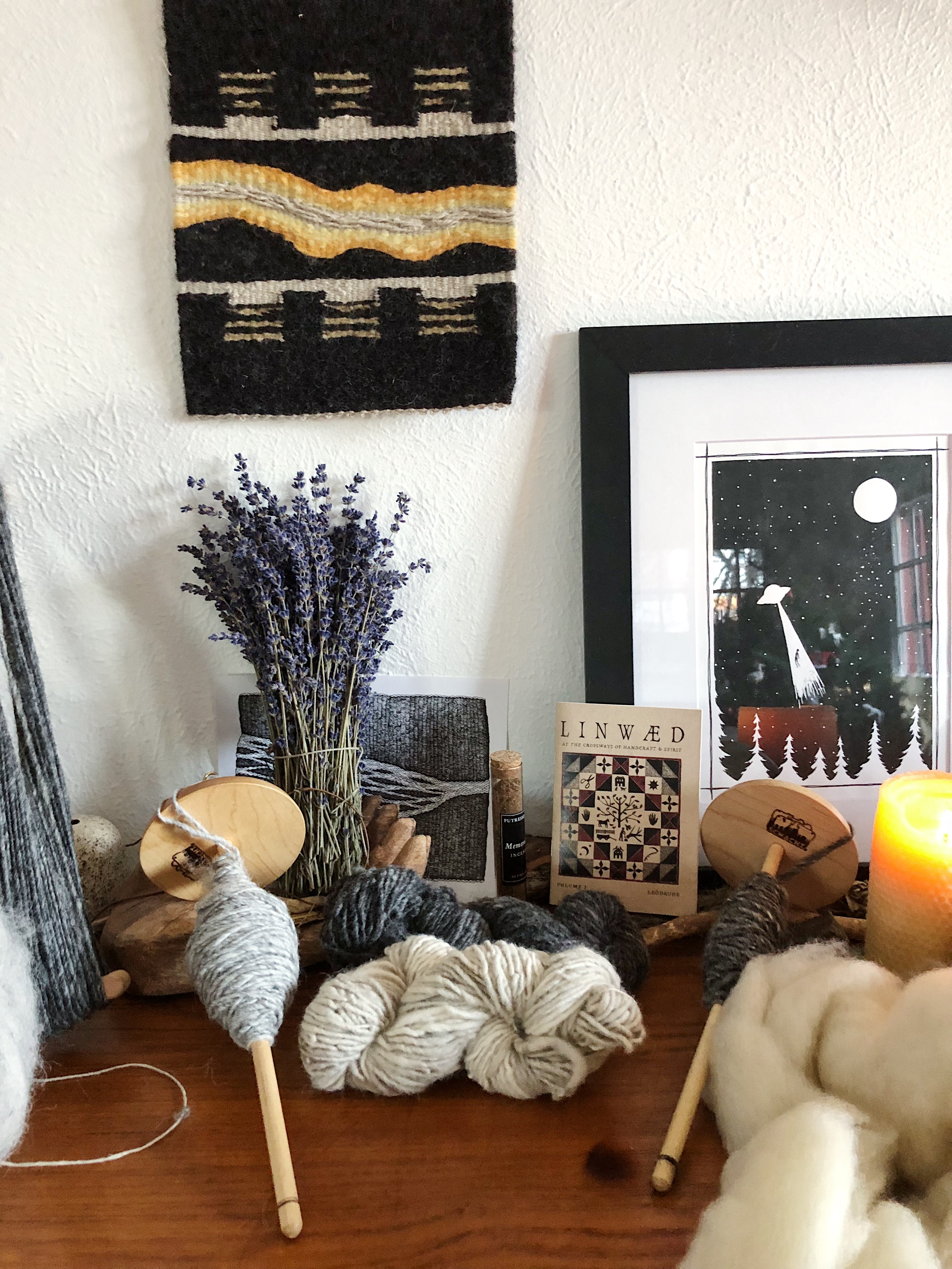 This is the sum total of my current handspun work from the last few months. This picture displays skeins stretching on niddy noddies, skeins in progress on drop spindles, skeins of yarn waiting to be used in weavings, and my balls of shetland roving from various Colorado flocks. Like anyone in late stage capitalism, I often question if I am “productive” enough. It helps sometimes for me to play along with that unwanted inner voice and just put everyone out on display. After standing back and surveying the results, I can always see the hours and hours I have poured into this work of spinning my own favorite gauge of single ply tapestry yarn. I also see all the work that has to be finished still to move onto larger projects.