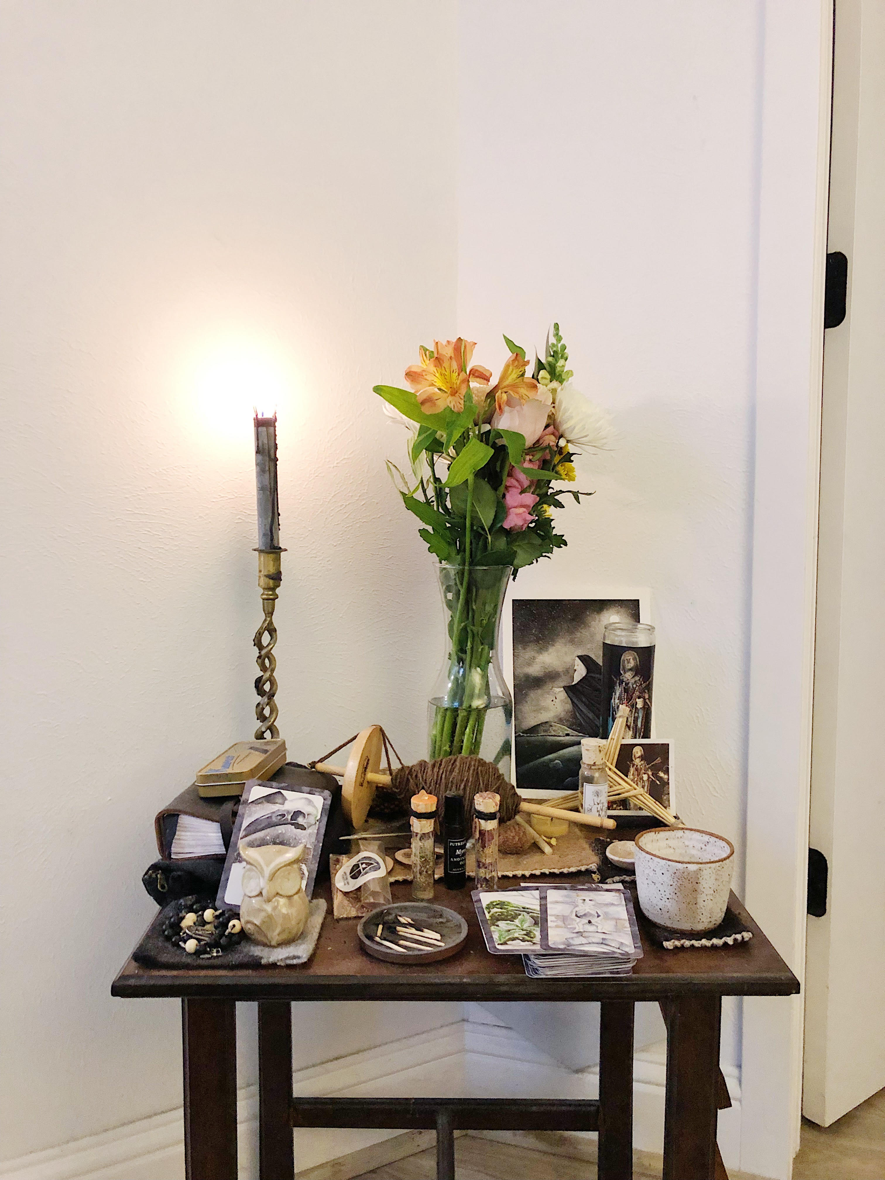 I must attribute this development to Jennifer Rose Marie Serna of Wapato Island Farm, who entrusted me to make a ritual cloth for them with my handspun Shetland. It’s not often the case that folx contact me for fiber magic, but when they do my heart sings. I am so thankful Jennifer saw me in this work and asked for a piece. For this spinning, I periodically sprinkled rose water on the copp of yarn accumulating on the spindle to infuse it with each parts protective and heart supporting energy. Finally, I set the spindle on my ancestral altar to rest with Brighid, the Morrigan, the Cailleach, and my mom watching over it. It was really all I needed to fill me up with so much gratitude for this craft. Could you imagine a world where this is the sort of work we did everyday? I could. Maybe one day it will be possible.